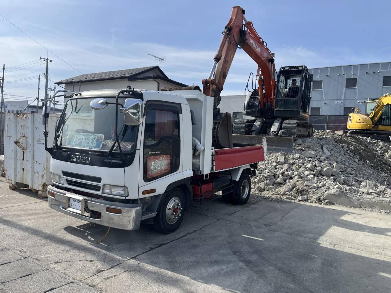 本日は、重機を使用し、解体した壁や床のコンクリートを細かく砕き、ダンプカーへ積み込む作業を中心に行っています。